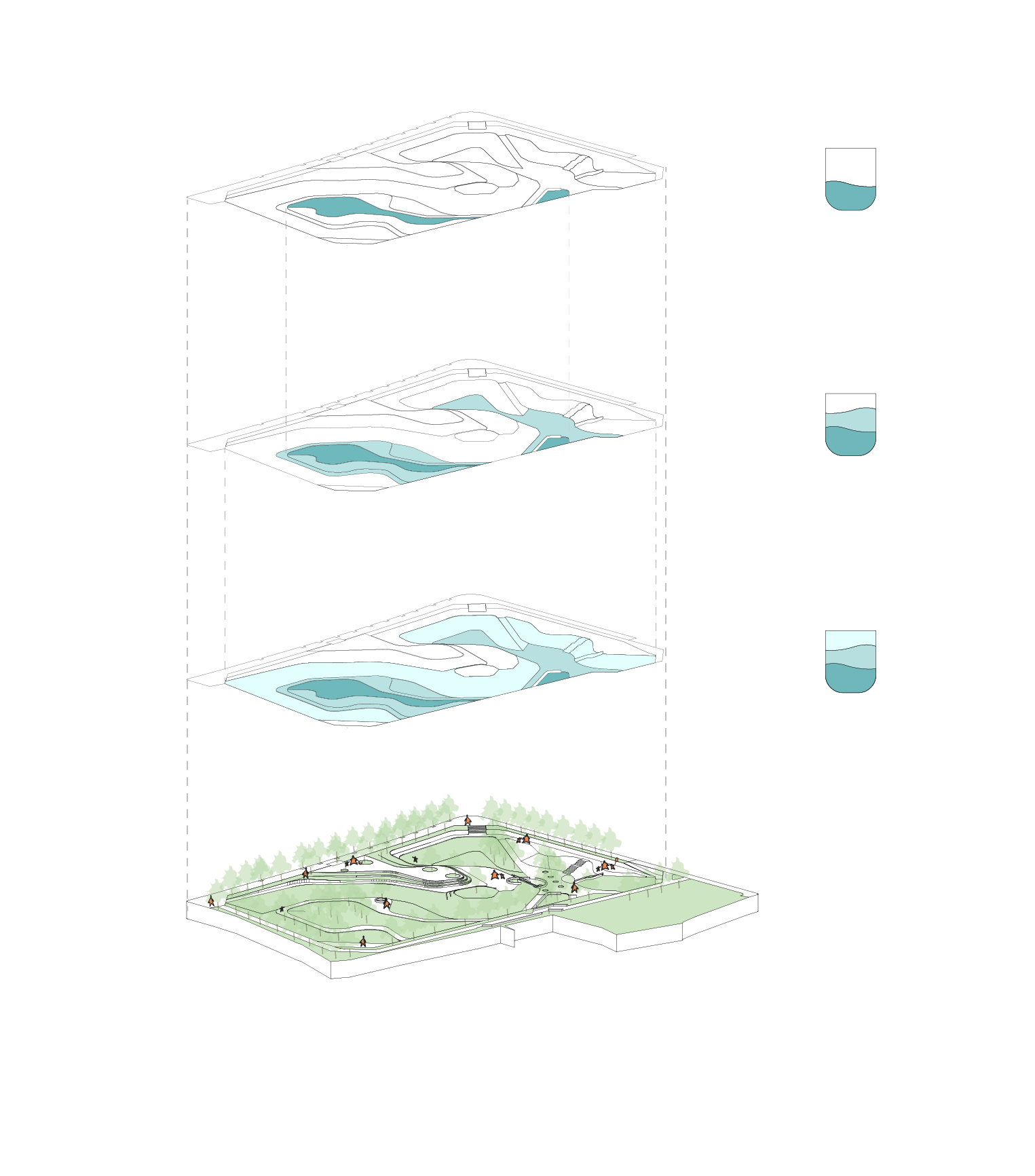 滯洪池透過高程設計,以分段滯洪,讓公園除豪大雨外不全面性影響活動使用,水位高程分佈如下:
