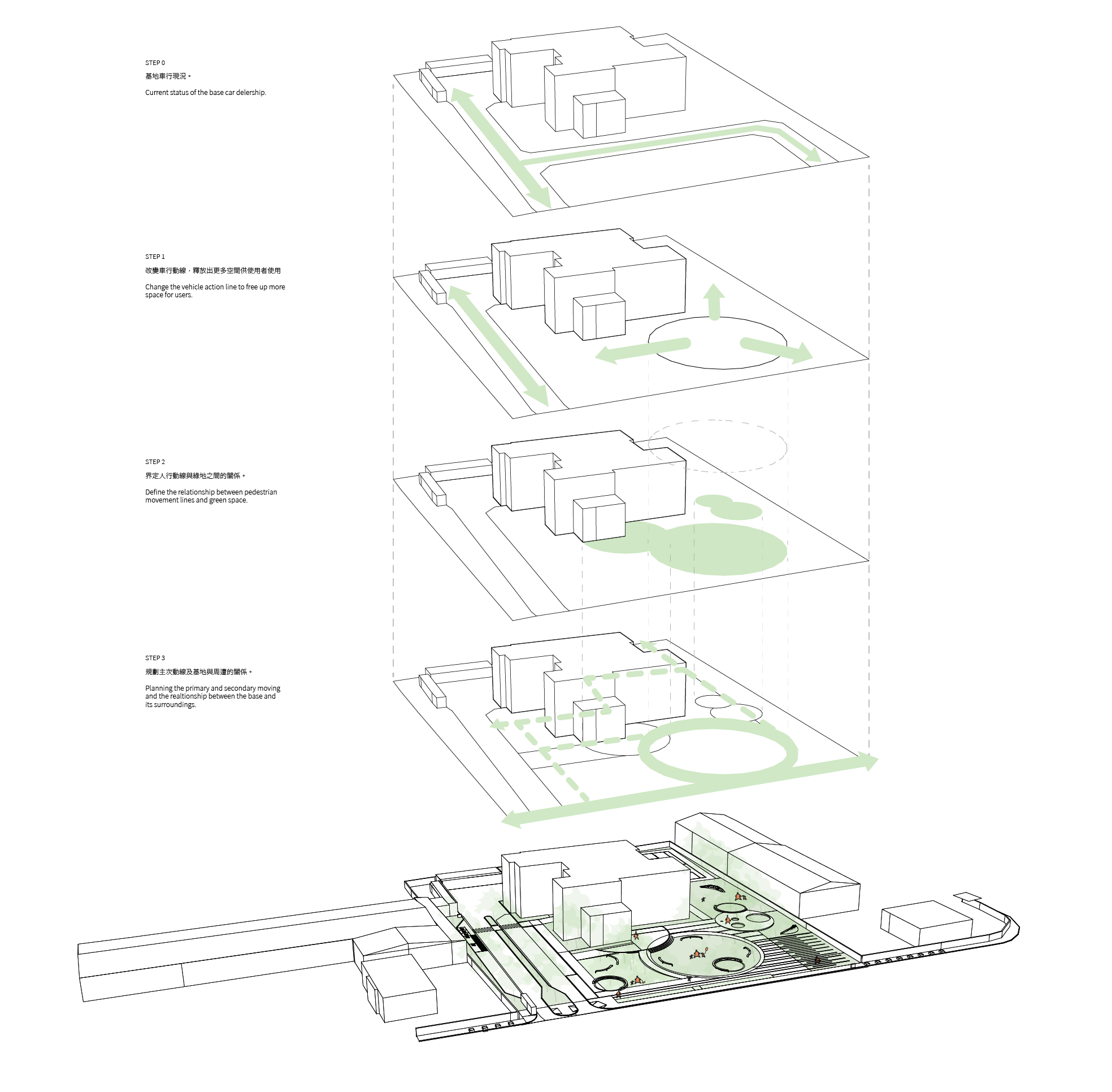 了解建築與周邊空間環境,受到動線影響是核心關鍵,多處人本動線受到車行道路動線截斷,因此本案將優化策略的方案,鎖定於車行動線格局上的討論,並研擬四個方案進行優缺比較。最終以車行動線集中設置,集中於西側,將車行動線的擾動降至最低,前庭空間可完整延伸至後院,使全區人本( 開放) 空間最完整。將動線西偏調整後,把前庭空間門面呈現出來,提升基地的自明性,並以都市客廳的概念作為設計發想。