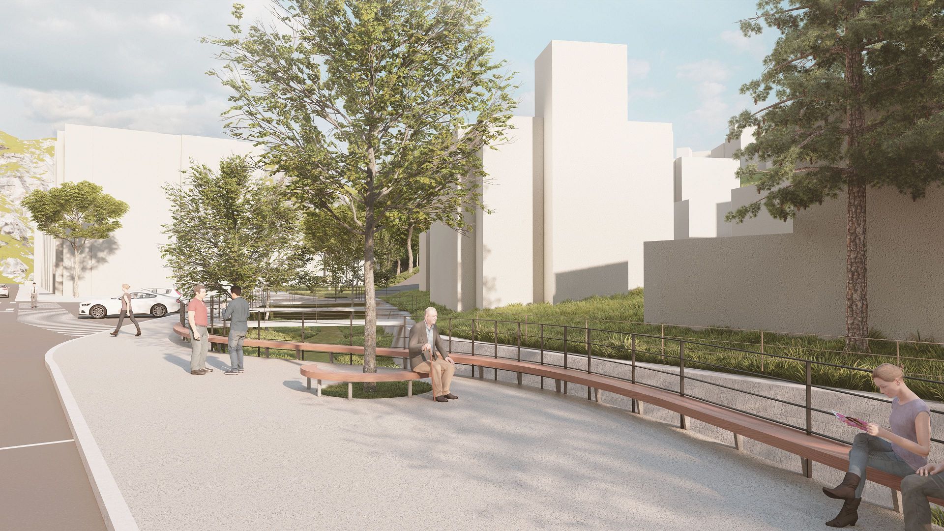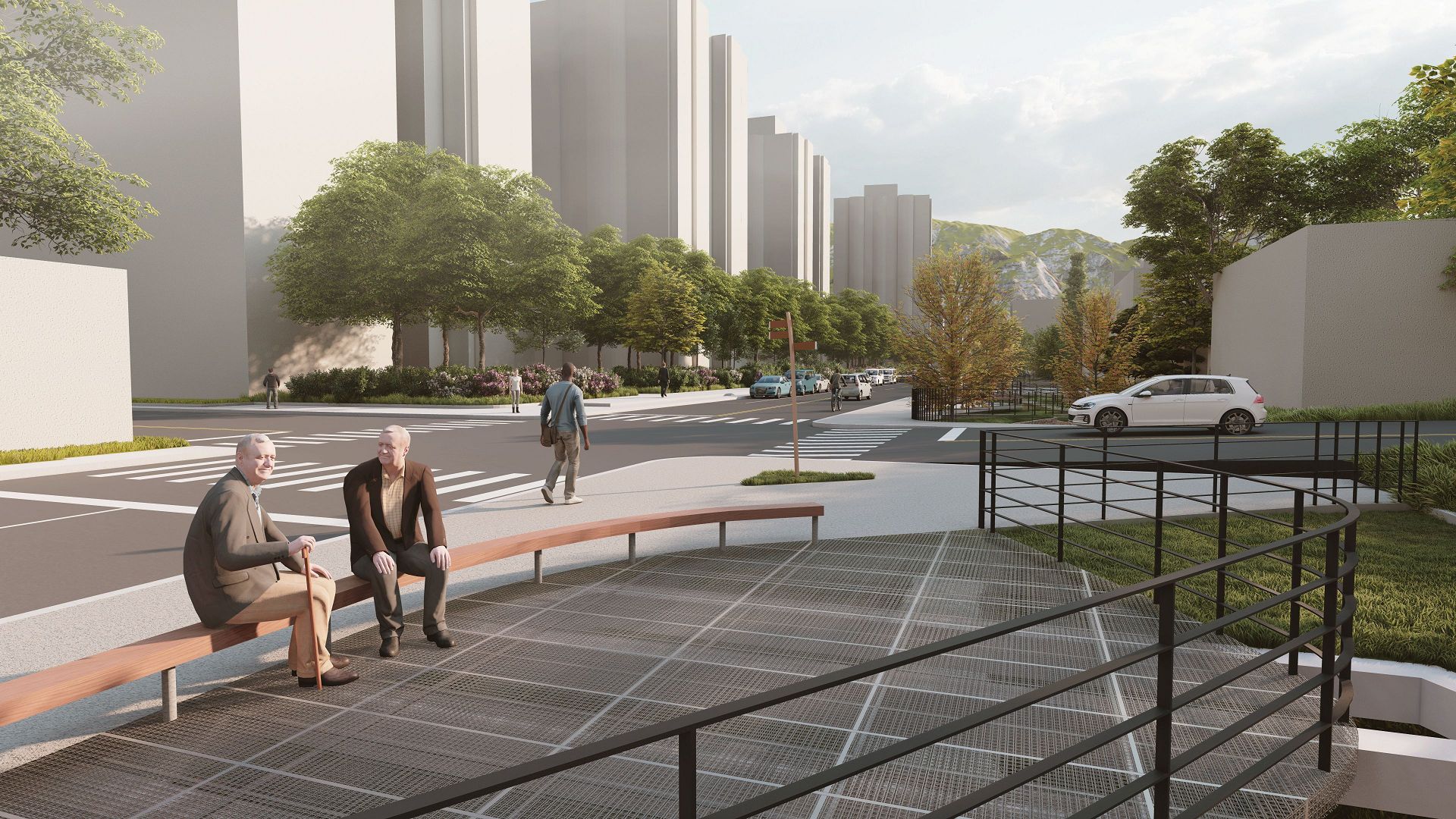 綠地西側規劃水綠散步道,提供南北聯絡步行系統,並檢視既有無障礙空間、通用設計等,營造「迎賓廣場、樂活平台、水綠步道、森活綠地、綠蔭休憩區」等空間。