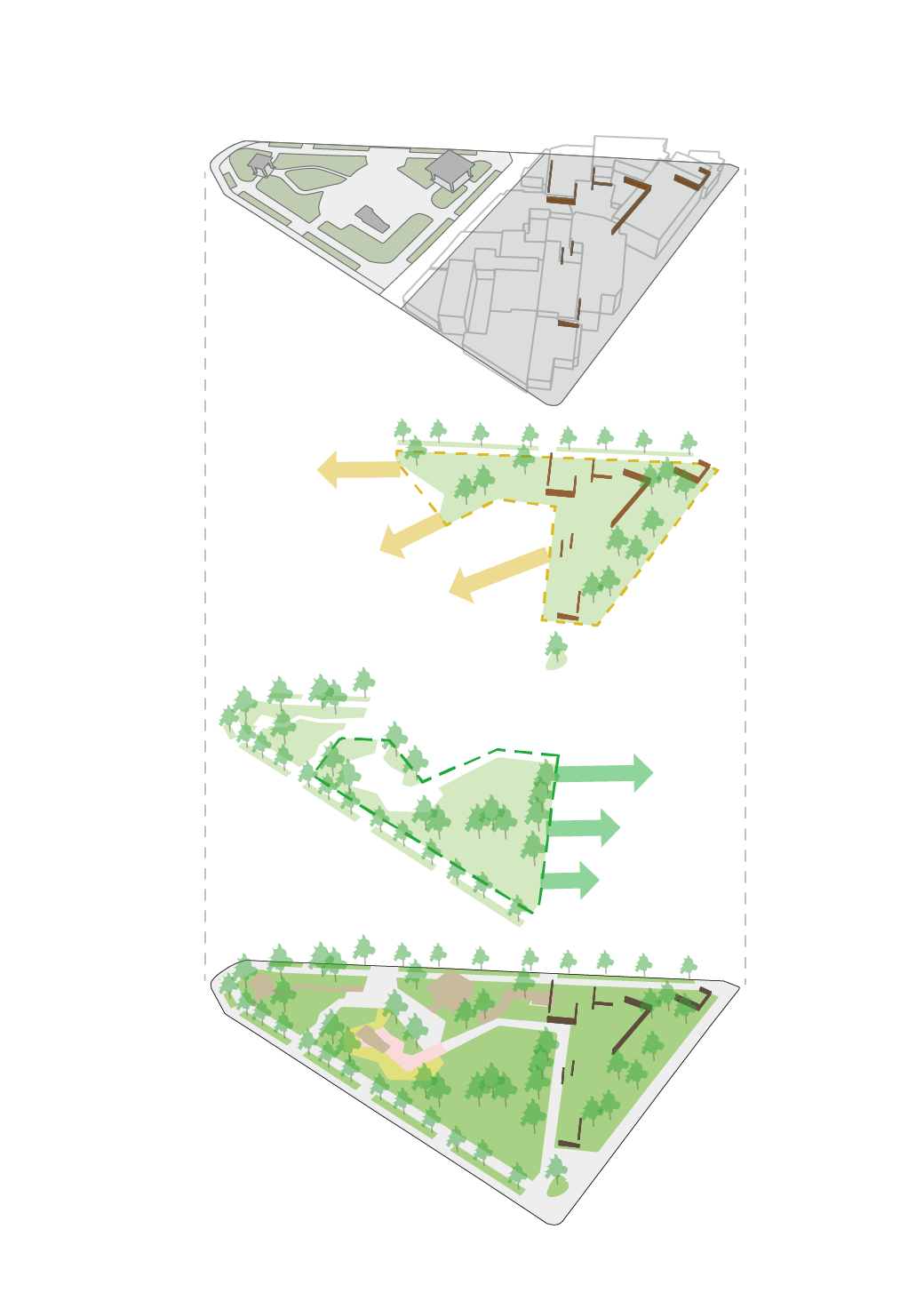 鄰里生活綠廳:以開放性的草坪空間取代原有建築聚落與空間切割的關係,並整合原有公園內部空間重新連結,提供市民生活上的綠色客廳;在現況調查中發現公園東側建築群有部分建築仍是磚造或木結構等形式,在房舍拆除過程中留下部分磚牆,加入周邊環境元素 ( 如:紅磚牆、洗石子階梯等,並利用地形高低差重現過去崁頂區意象,形塑在地獨特地景風貌,同時立面上可搭配彩繪、解說導覽的方式,讓市民可以重新閱讀過去崁頂文化。