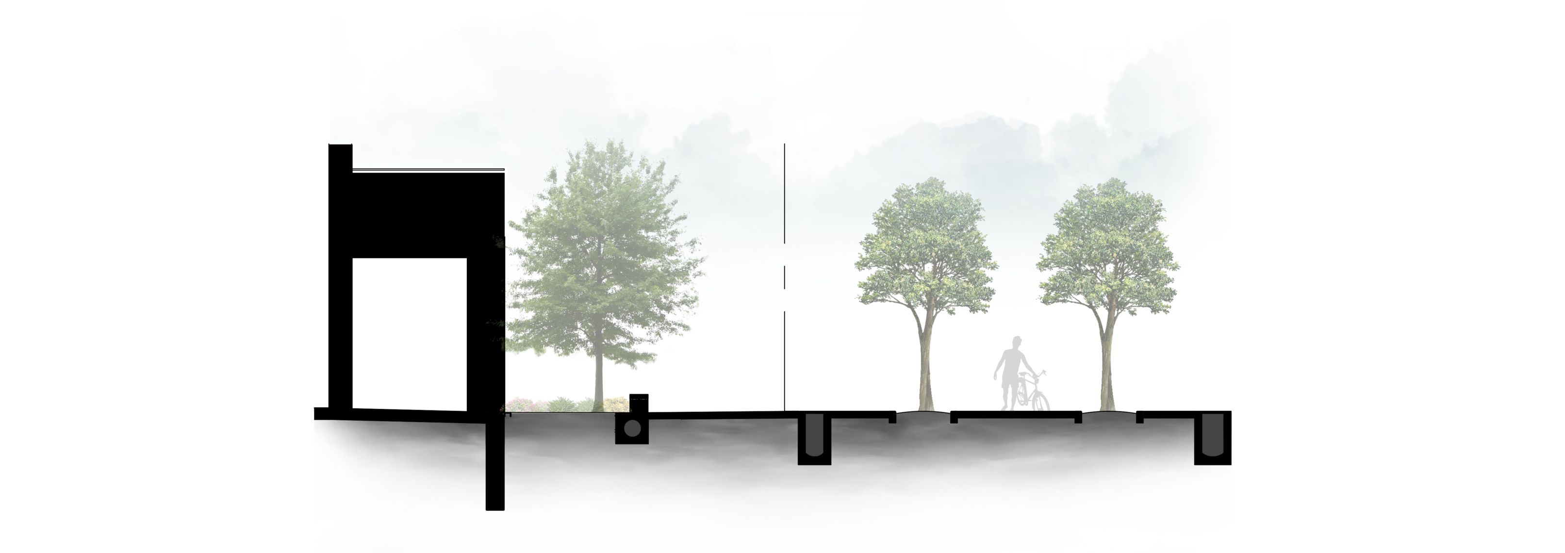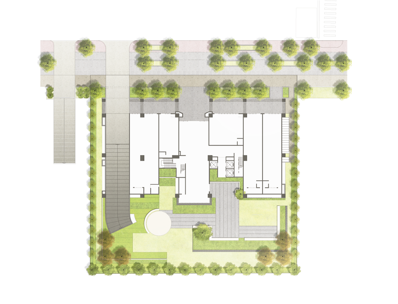 本基地位於淡海新市鎮,對外之人行道、入口意象及外圍景觀廊道首重與周邊大環境協調,在延續鄰地景觀序列性的同時,亦營造出合宜的空間區隔,維護各建築群之獨立活動需求及空間私密性;對內之住宅中庭及綠帶空間則滿足居民休憩、公共活動、親近自然等空間需求,營造具景觀美學、空間品質、人際互動的戶外休憩空間。 基地北側入口之喬木選用楓香,營造新市二路四段之景觀風貌;基地東西二側外圍綠帶選用台灣原生種之土肉桂、厚皮香等喬木,營造闊葉、細葉扶疏有致的綠牆茂密效果;基地南側外圍選用樹形優美的台灣原生種光臘樹、烏臼,打造質感細緻的枝葉觀賞性及隨季節更變的精彩葉色風貌;庭園內部以山桂花、白水木等二棵優型樹為主角,打造香氣宜人、枝幹有型的空間聚焦主題效果。 本基地之鋪面依不同分區需求打造三種樣態設計。A 型鋪面位於建築物騎樓空間及入口處,為重要人行空間,型塑重要大門入口意象,鋪面設計與建築設計及列柱韻律相呼應,達到聚焦空間效果及方向引導性;B型鋪面位於建築中庭花園,以塊狀模組及間距打造細緻景觀地坪變化,能同時因應花園內灌木、地被、草地植栽的有機生長,達到良好的軟硬鋪面交織效果;車道鋪面配置於地下停車道,具防滑及緩衝效果;遊戲場無縫地坪規劃於兒童遊戲場,以充滿趣味、親近自然、質地柔軟安全的鋪面素材提供兒童豐富有趣的空間體驗;卵石鋪築以細卵石達到空間介面的收邊效果,增加透水性鋪面,以軟性收邊軟化空間交界。 本基地之景觀設施包含圓形桌椅組、長型座椅等提供住戶野餐、休憩使用的休閒停駐設施。以及花台、擋牆、座台、植栽分隔板等景觀設施物,提供複層灌木的種植空間,營造多變的景觀層次外,亦是地形高程及景觀界面收邊的重要設施元素。
