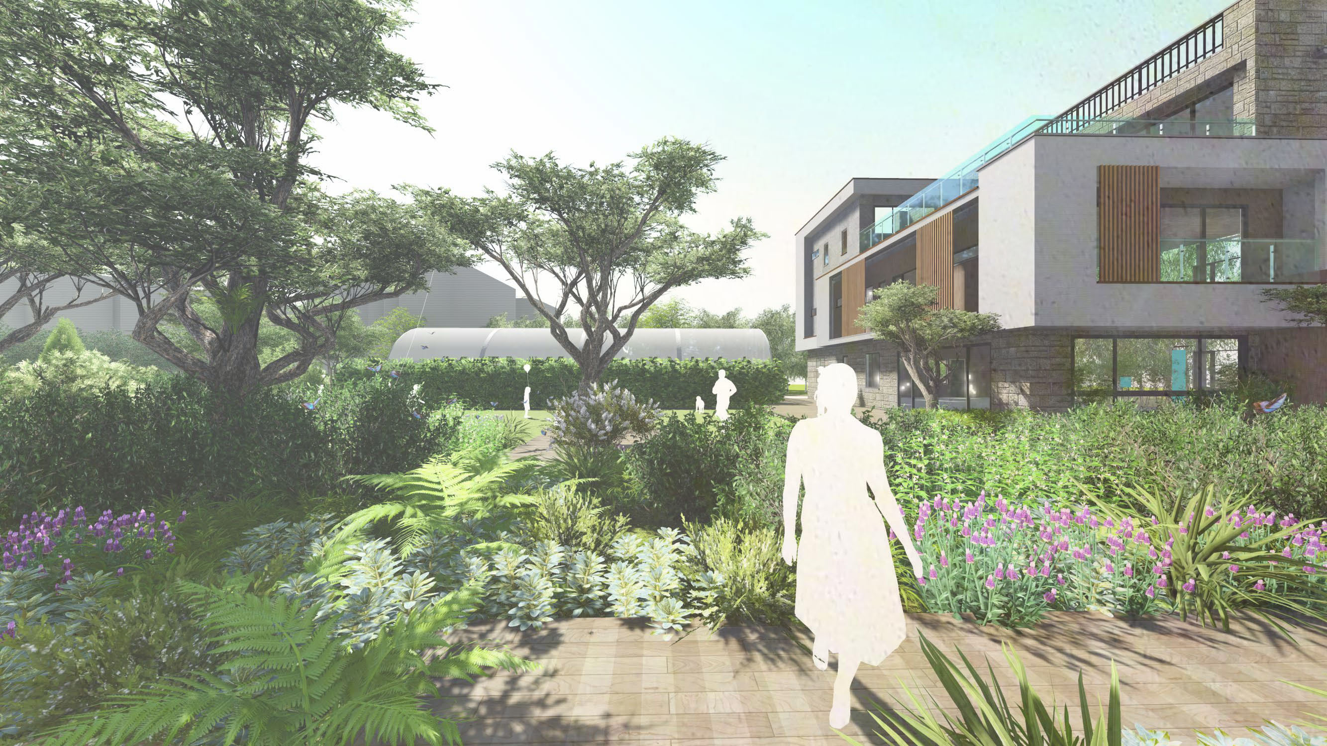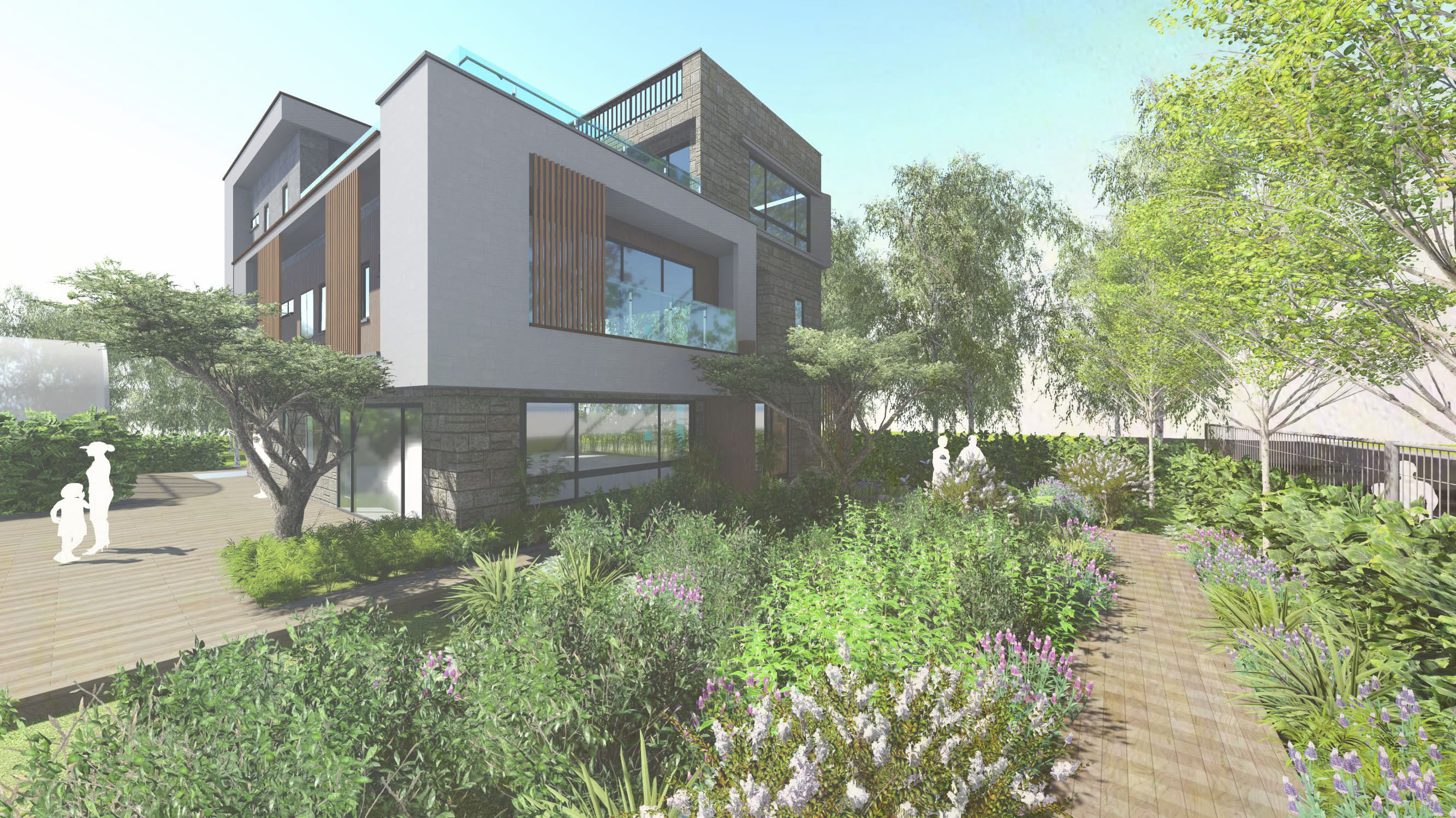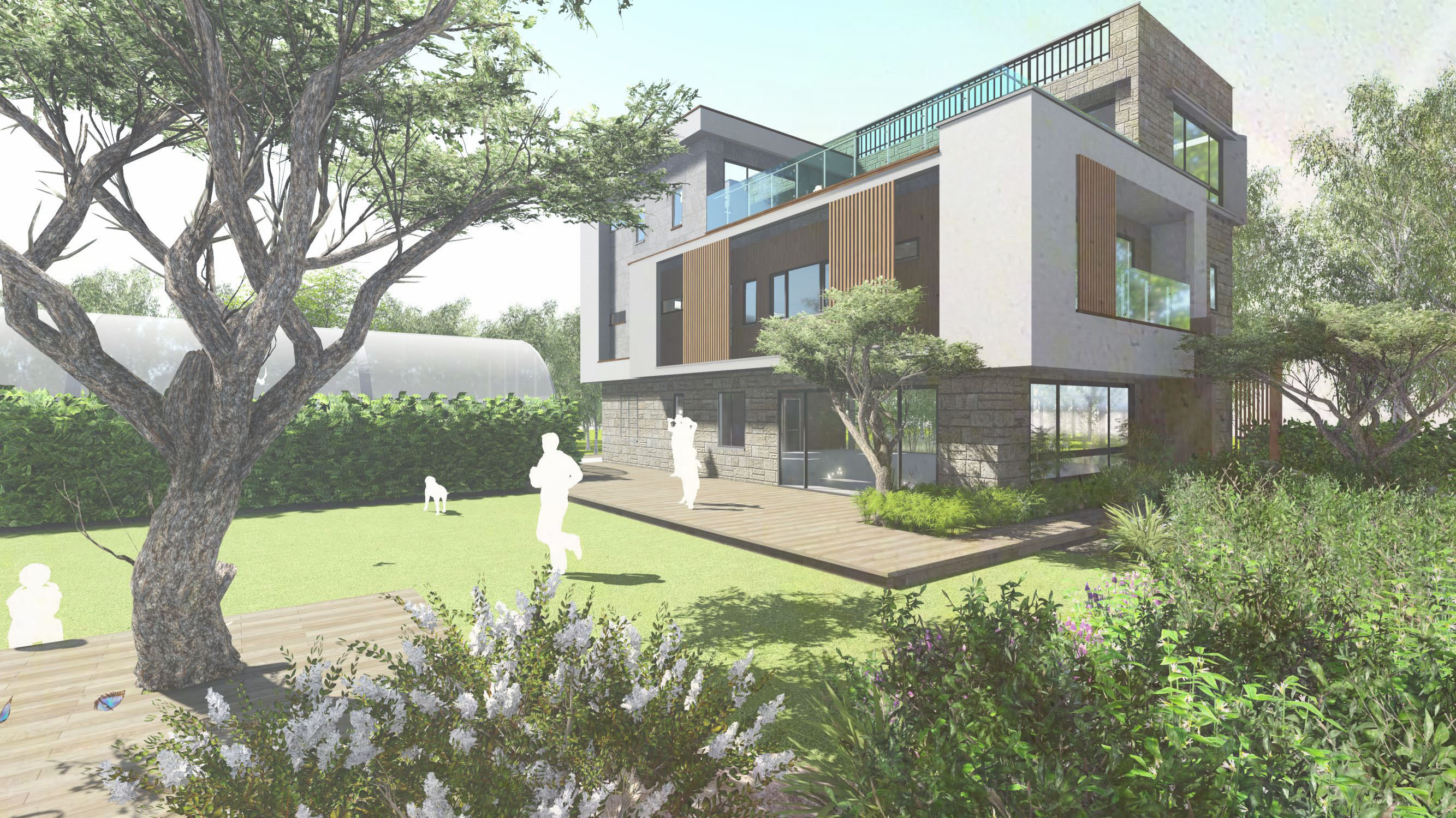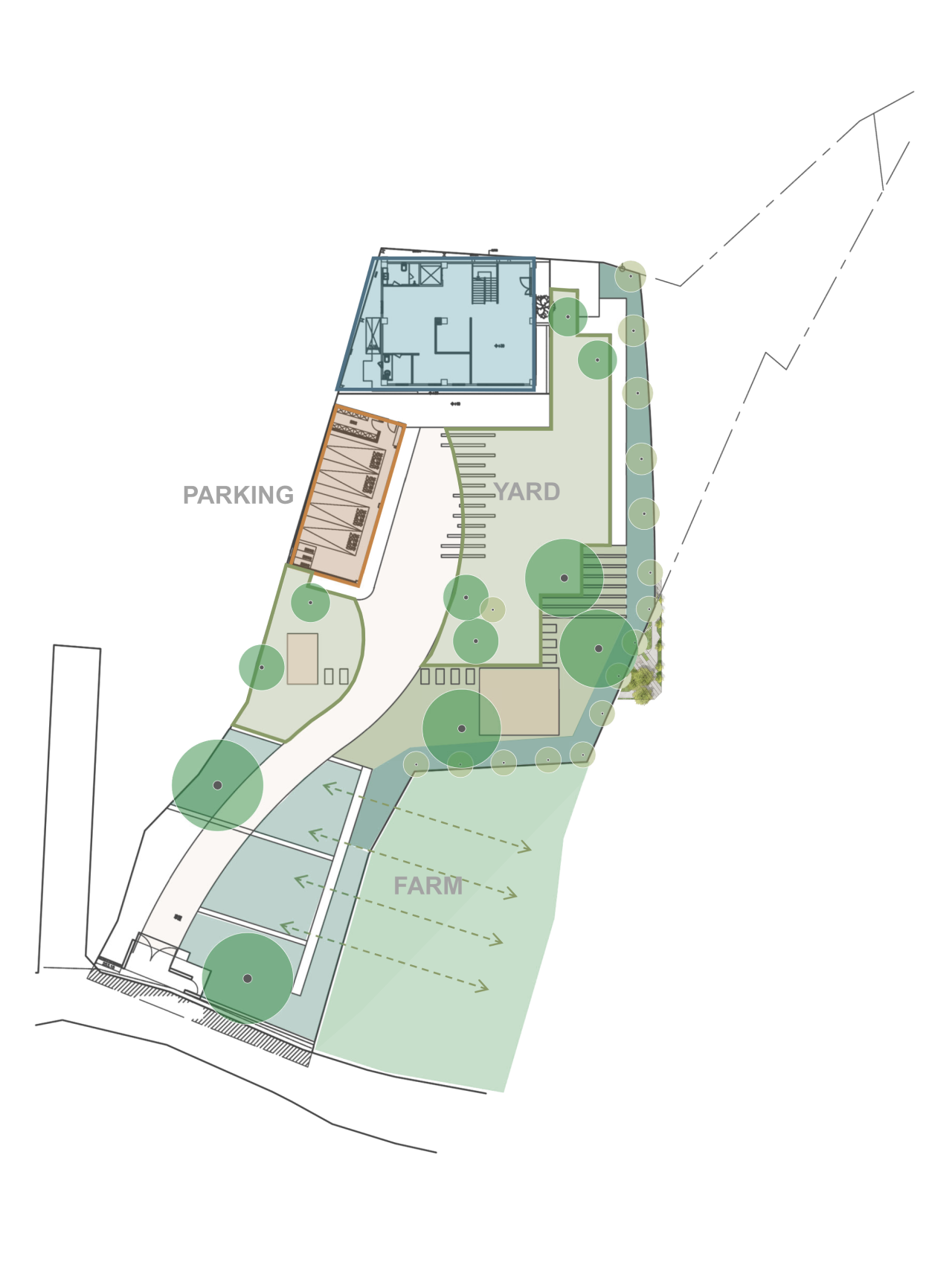 除住宅空間以外,將空間區分為入口花園區、生活庭園核心區、停車區、農耕區、承租預備區等區域。 入口花園區,以複層栽植進行營造,以喬木層、灌木層、地被層三層搭配,進行植栽配置。 生活庭園核心區,以留白(草皮)方式進行營造,讓大人、小孩能於建築與庭院景觀間跑跳、休憩;並配置主景樹,型塑空間主體及份量感。 停車區:規劃停放5~6輛汽車停放空間。 農耕區、承租預備區:種植苗木果樹,並於邊界增設綠籬進行內外區隔。